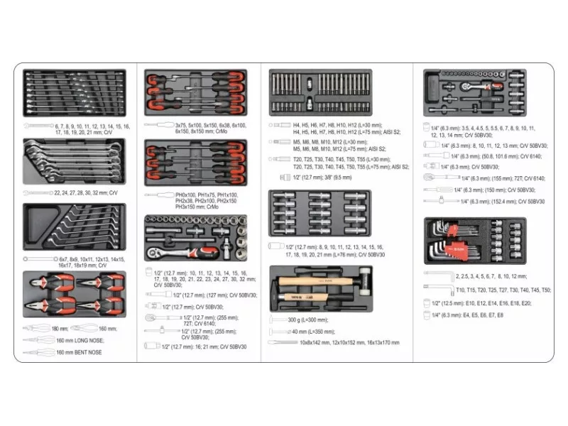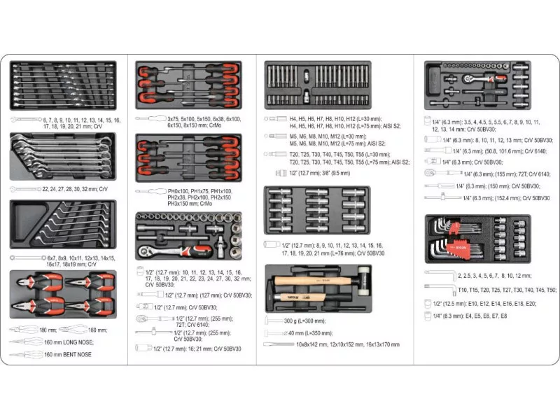 - HEX wrenches, TORX, sockets, 25 parts (1/2” (12.5 mm): E10, E12, E14, E16, E18, E20; 1/4”(6.3 mm): E4, E5, E6, E7, E8, HEX: 2, 2.5, 3, 4, 5, 6, 7, 8, 10, 12 mm; TORX: T10, T15, T20, T25, T27, T30, T40)
