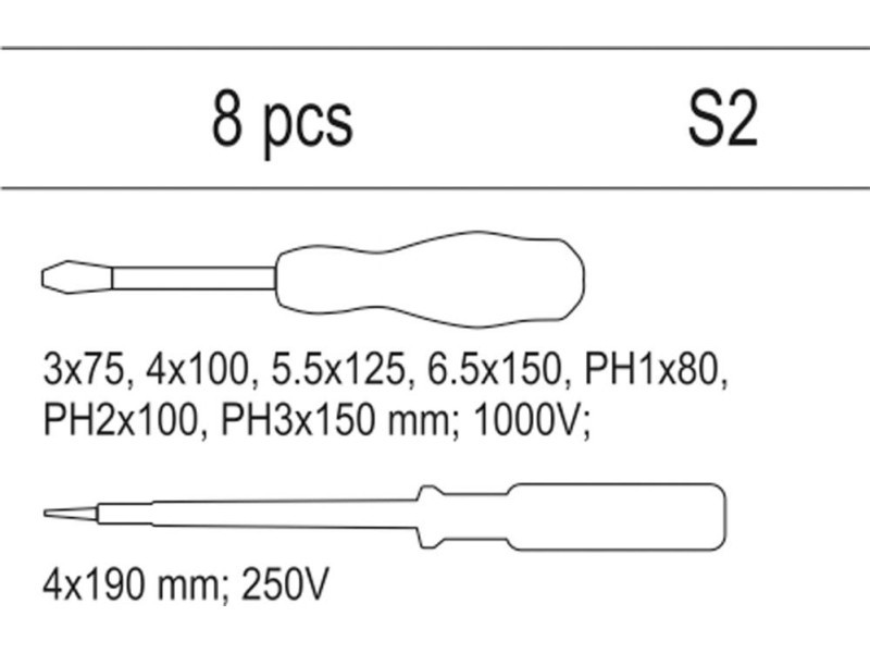 Schubladeneinsatz, in dem isolierte Schraubendreher zu finden sind. - Einsatz - isolierte Schraubendreher 3x75, 4x100, 5.5x125, 6.5x150 1000V - isolierte Schraubendreher PH1x80, PH2x100, PH3x150mm 1000V - elektrischer Musternehmer 4x190mm 250V