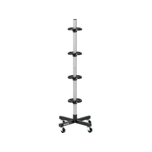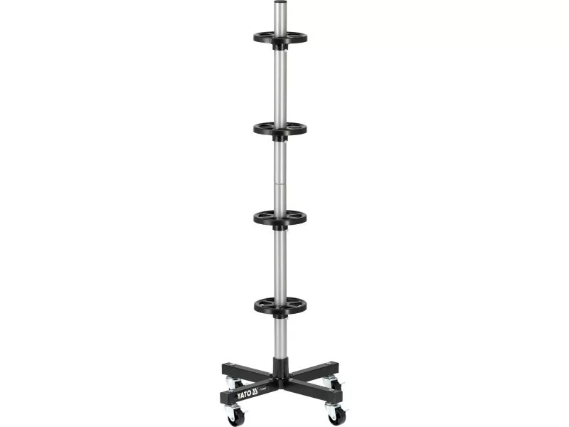 Mobile stand designed to store car wheels. Does not deform the tires, ensuring their proper alignment. Folds sequentially, so it takes up very little space when folded. Allows you to store tires without losing pressure. Ensures proper tire storage. Includes wheel rim protection pads, ensures safety of alloy wheels. Fits all common types of passenger car tires up to 225mm wide. Suitable for 4 wheels with a maximum tire width of 225mm