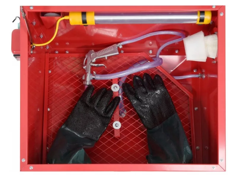 Pneumatic sandblaster cabin for fast and convenient cleaning of rust, paint and dirt by means of circulating closed circuit abrasive. Indispensable in automotive workshops and industrial plants