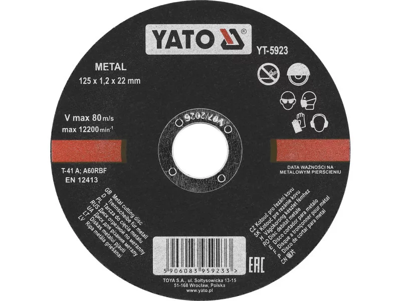 Metal cutting disc by YATO brand, made of high-grade abrasive material of suitable hardness and granulation.
