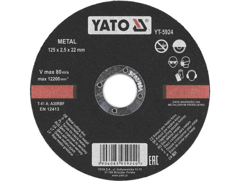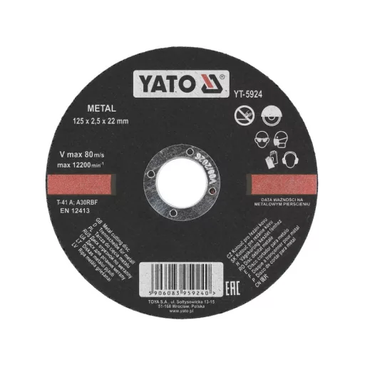 Metal cutting disc by YATO brand, made of high-grade abrasive material of suitable hardness and granulation.