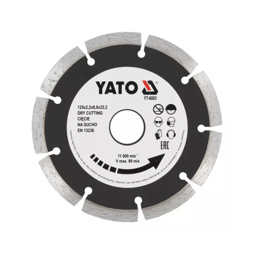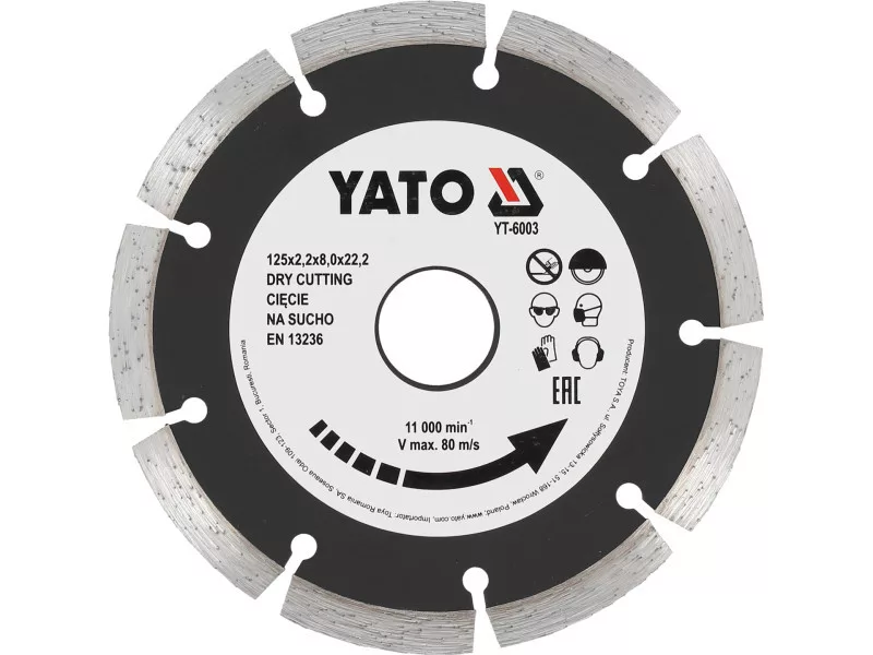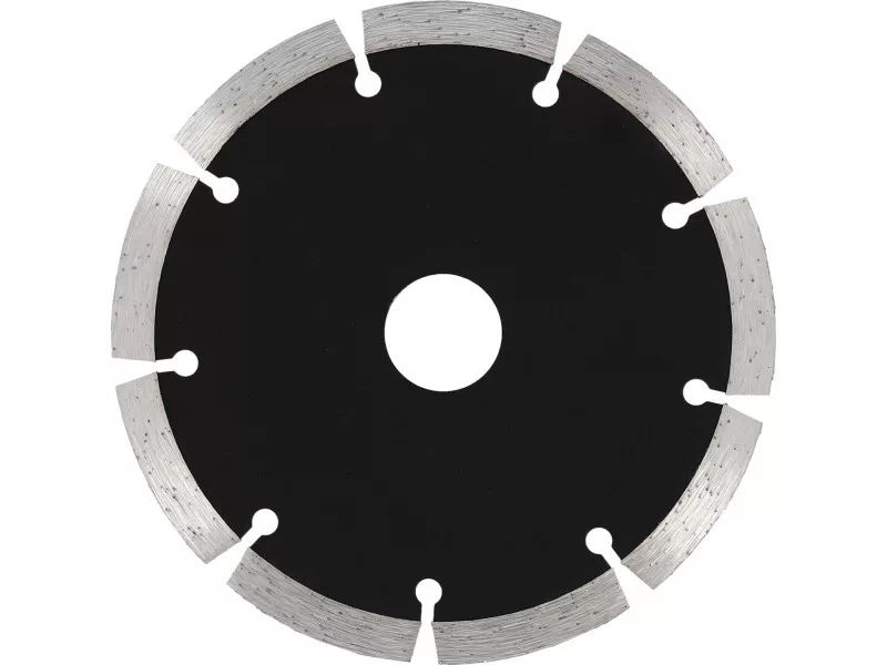 Diamond shield for angular grinders equipped with segments with a height of 8 mm laser welded. Designed for "dry" work. Recommended for cutting hardened concrete, brick, silicate brick, granite, wall, stone. Recommended speed approx. 11,000 rpm.