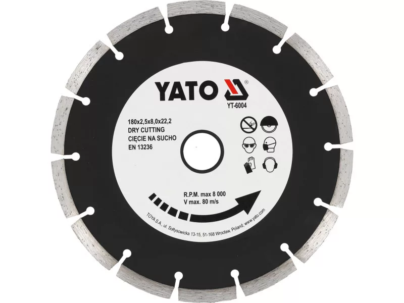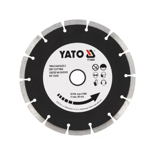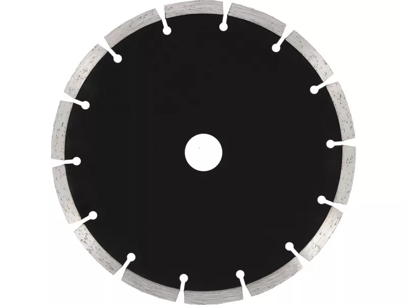 Diamond shield for angular grinders equipped with segments with a height of 8 mm laser welded. Designed for "dry" work. Recommended for cutting hardened concrete, brick, silicate brick, granite, wall, stone. Recommended speed approx. 8000 rpm.