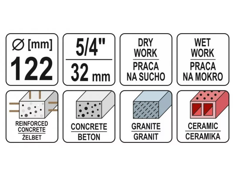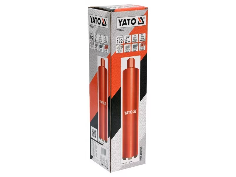 YATO crown drill bit for drill rig designed for non-hammered operation – dry and wet – with a drill rig (such as YT-81980). Allows fast and precise drilling of holes, even without a tripod, in reinforced concrete, concrete, silicate, such as. under electrical boxes, drilling ceilingsów for pipes and cables, installation of cable routes or ventilation ductsów.