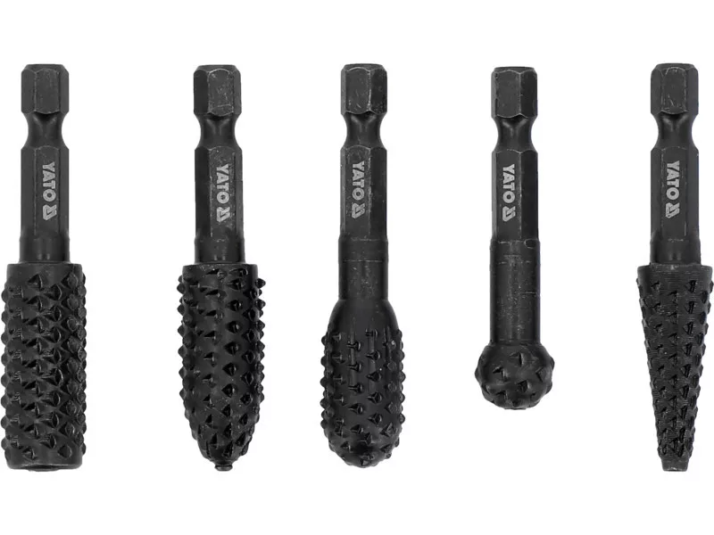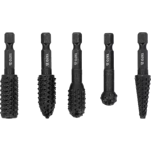 Rotary file set made of blackened carbon steel. It is used for woodworking, enlarging holes when fitting door locks, fitting carpentry joints and chamfering edges.