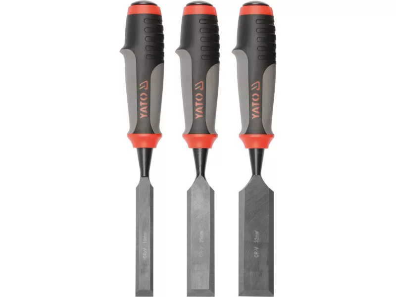 Carpentry chisels with a handle with special plastics adapted for beating. CRV steel blade. Milted blade edges. The kit includes chisels with widths of 16.25, and 32 mm. Tool surface black. Chisels for carpentry work for woodworking and some wood -based materials.