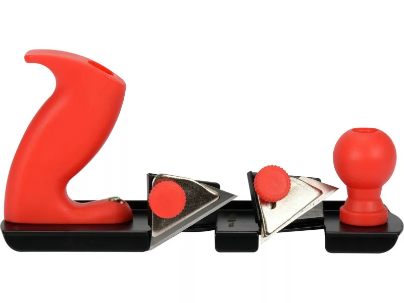 Two -tone metal stream designed for processing the edges of gypsum, wooden or wood -based panels, etc. The stream body is made of 2 mm thick steel sheet. On the right side of the body there are two typical manganese steel trapezoidal blades with a 65mn symbol / blade length approx. 61 mm x height- 23mm height, the blades have two cutouts determining the fastening. The front and rear stream handle is made of ABS plastic. The base length is 235 mm width 53 mm. The base profiled in a way appropriate to work on the edges of the plates or narrow elements, e.g. slats. Available replaceable blades, e.g. YT-7527 or Vorel 76010
