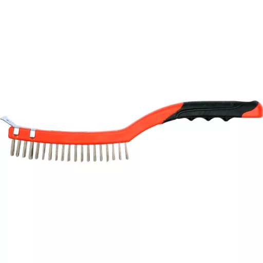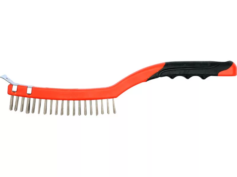 Made of stainless steel spring wire permanently embedded in a plastic body. Brush profiled to increase cleaning efficiency. Finished with a scraper made of stainless steel.