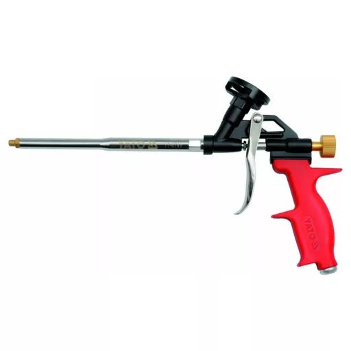 Pistol designed for the application of polyurethane foams. High quality - thanks to the use of suitable materials: stainless steel, aluminum and brass. The elements most susceptible to dirt and damage from the aggressive action of foams and corrosion, have been additionally protected with PTFE coating.