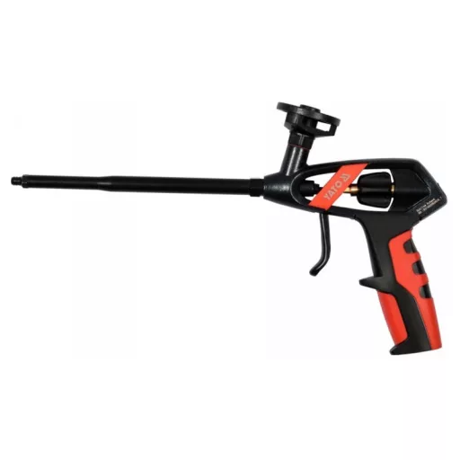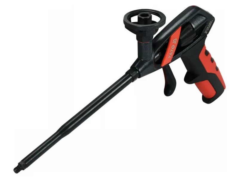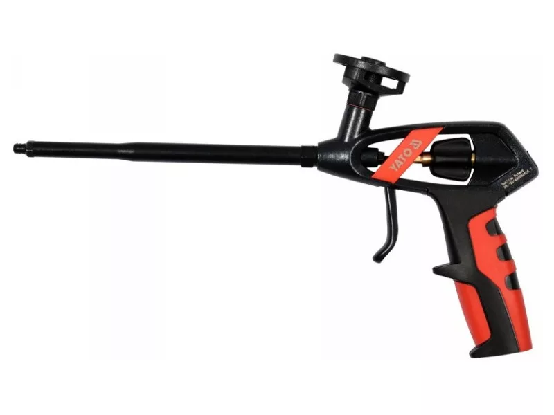 PU foam gun. A special feature of this gun is ergonomic knob to adjust the flow of foam, placed in such a way that it allows you to adjust with one hand while it is flowing. In traditional guns, both hands are involved in the adjustment.