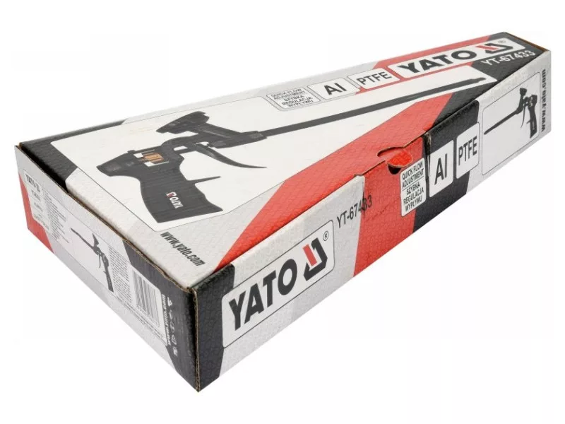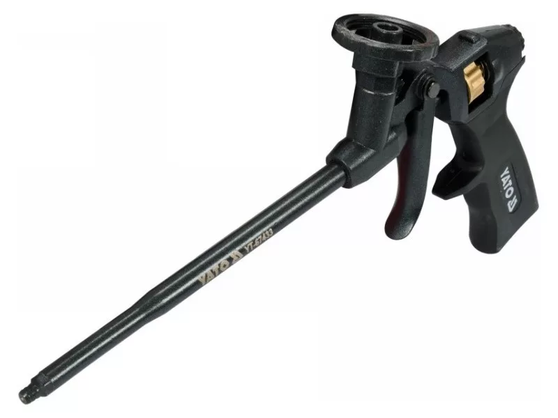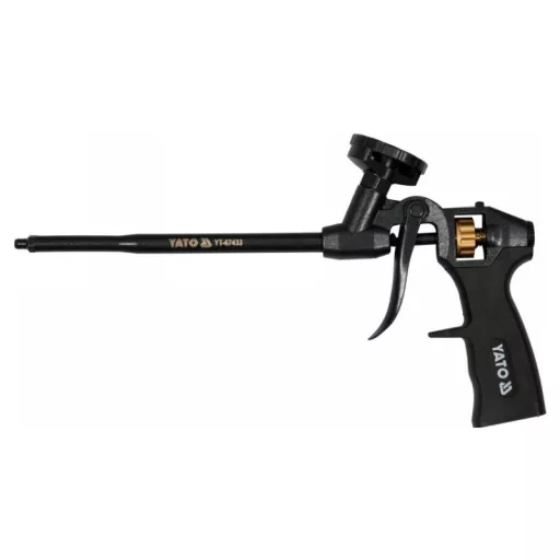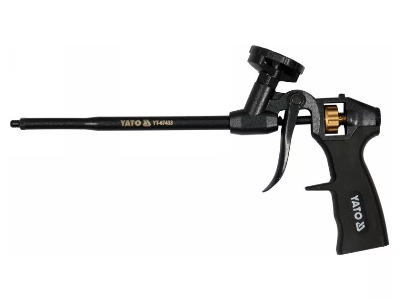 Modern high quality foam application gun. Made of aluminum and brass these materials ensure low weight and long service life . The body is fully protected by a PTFE coating reducing foam adhesion, making it easy to clean, the gun's main valveór equipped with a PTFE precision insert guarantees its long-term tightness . Noteworthy is the innovative solution to regulate the outflow of foam, the adjustment screw has been placed in such a wayób that you can control it with one hand using your thumb, without interrupting the application.