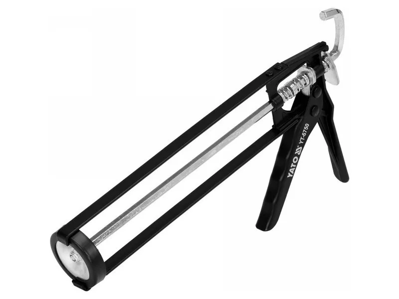 Skeletal mass squeezer, skeletal type. Lightweight, made of steel sheet, varnished. A convenient, profiled, ergonomic handle made of aluminum allows for effective application of thick masses, e.g. glues, sealants, lubricants, etc. substances from typical 300 ml containers. For easy squeezing of dense masses /e.g. Silicone / from typical 300ml containers.