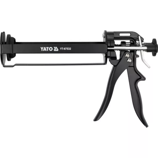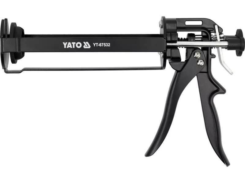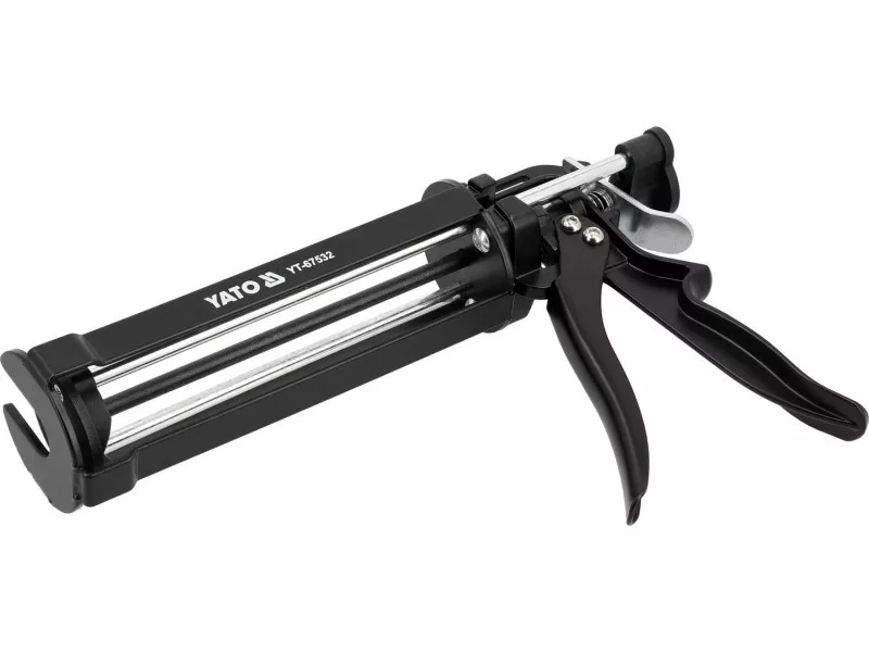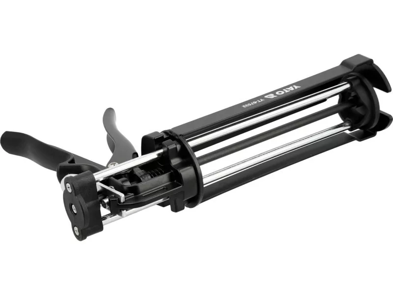 The reinforced sealant caulking gun is designed for professional application of silicones, acrylics, construction adhesives, and other materials in 300 ml cartridges. The 200 mm (9 inch) long design is intended for use with high-viscosity materials, where stability in piston movement and even material dispensing are crucial. The tool is effective in construction, assembly, and installation work, both for precise sealing and larger application ranges.