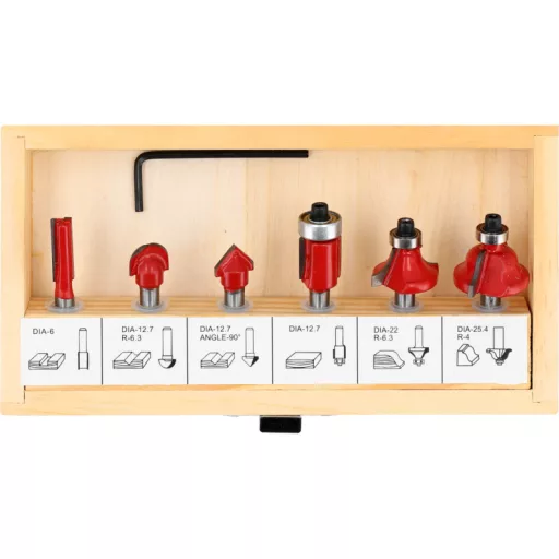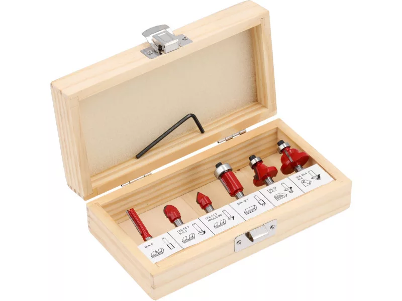 Set of 6 burrs for machining wood and some plastics using a milling machine with a fi 6 mm shank. The three edge cutters are terminated with a bearing to facilitate tool guidance. Set packaged in a wooden case.