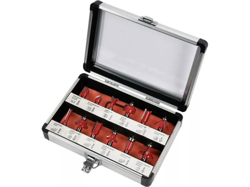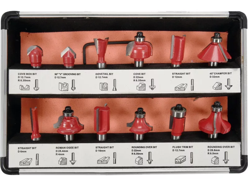 A set of 12 mandrel cutters for woodworking. Cut on fi 8 mm cuttings cutting tiles made of tungsten carbide with the YG6X symbol, the set includes six cutters ended with a bearing facilitating tools. Silver soldered cutters, 0.08 mm dimensions tolerance. For woodworking and wood -based materials using a 8 mm milling machine. 12 pcs, Allen key - 1 pc