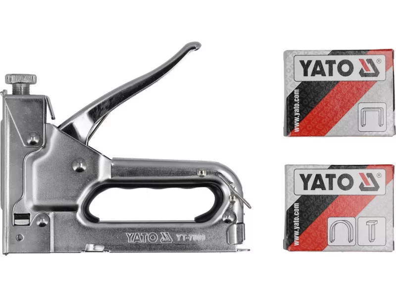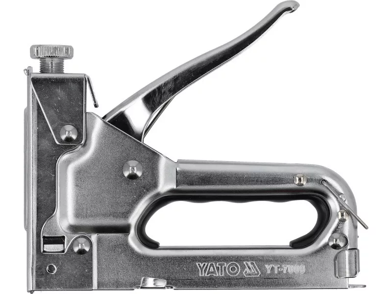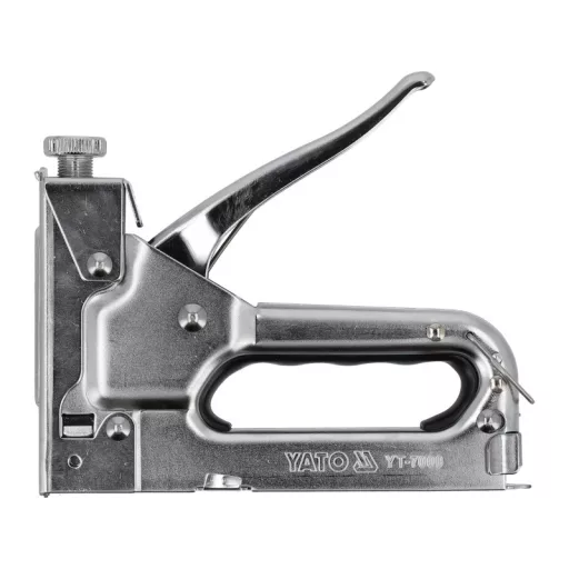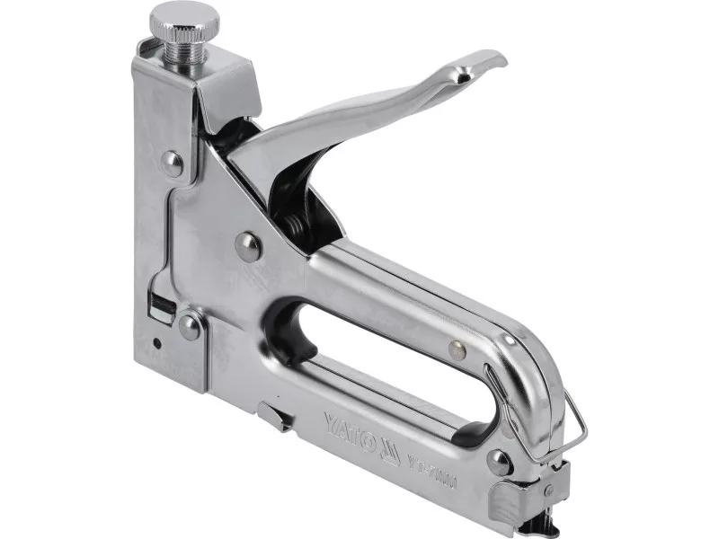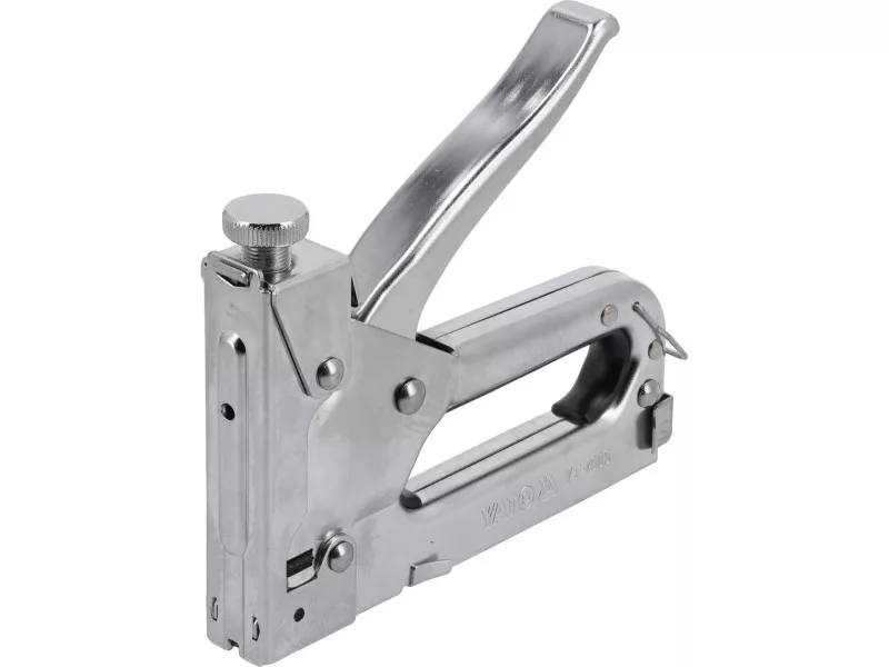Upholstery stapler designed for quickly joining different materials such as wood with fabrics, cardboard, paper, or leather. Used in upholstery, roofing, decorating, finishing, construction works, etc. It joins materials using a high-force driven steel staple or nail.