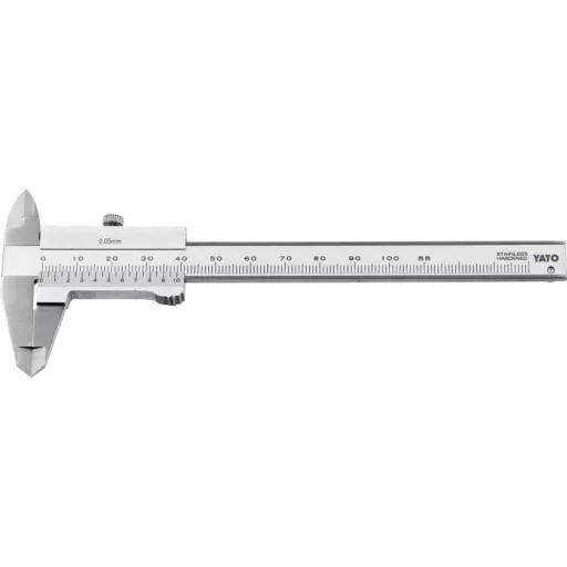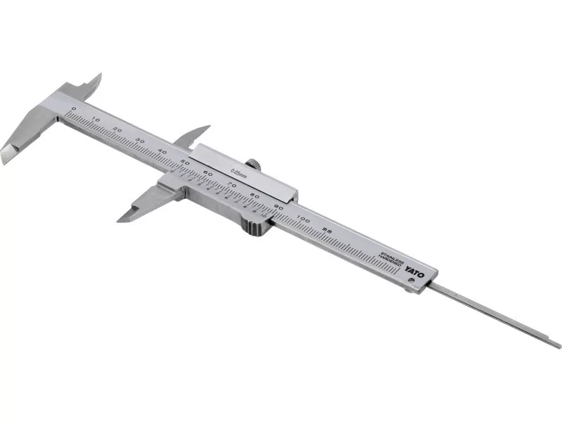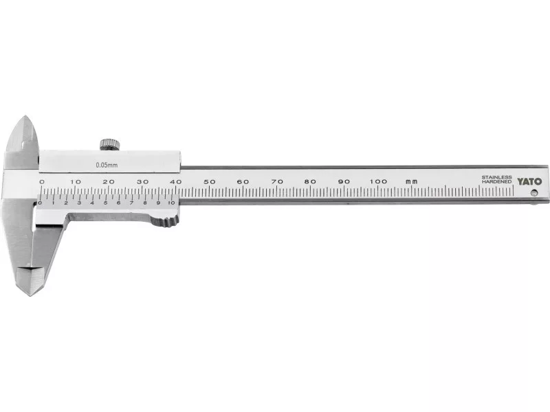 Stainless steel caliper for measuring length, height, depth and inside and outside diameter. Allows measurement in the range of 0-100 mm with an accuracy of 0.05 mm. Clear and legible graduation provides accuracy and ease of reading the indicated values.