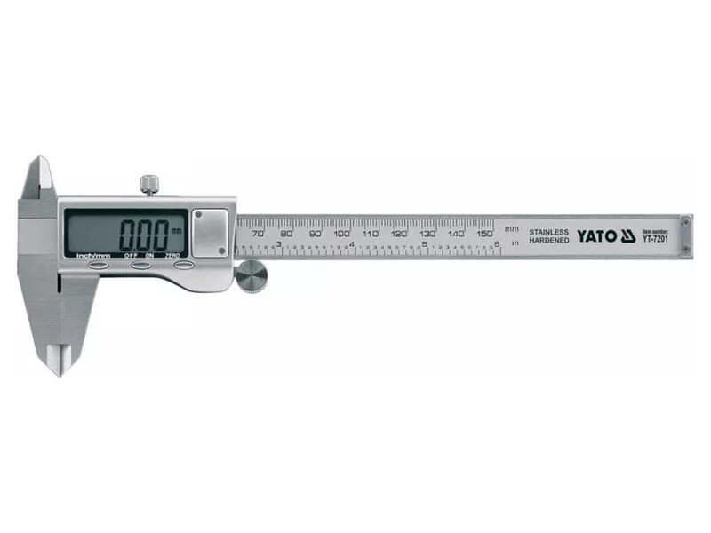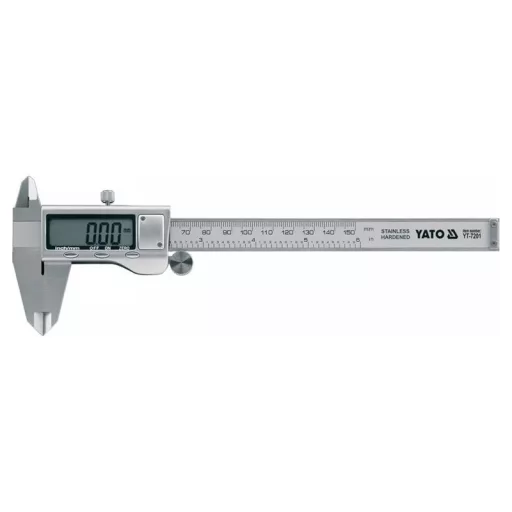 YATO electronic caliper made of stainless steel, with an accuracy of 0.02 mm and a measuring range of 0-150 mm.