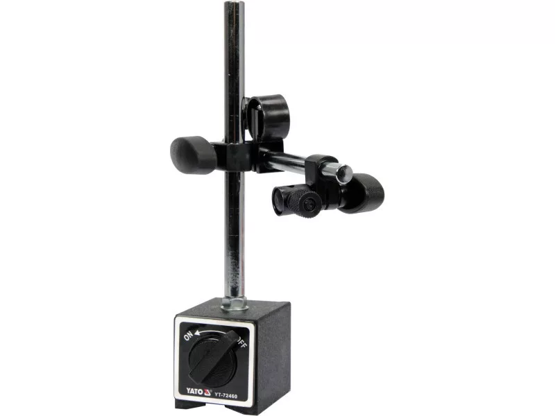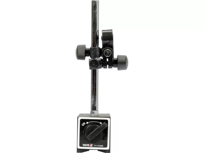 Professional magnetic stand YT-72460 for dial sensors YT-72450 and YT-72453. It has a spring joint for accurate positioning of the dial sensor on the measured part. Centrally locks the middle and upper joint at the same time with a knob. Magnetic base with prismatic groove on the underside. High pulling force ensures stable and secure connection with metal parts - detachment of the element is realized by a special knob.