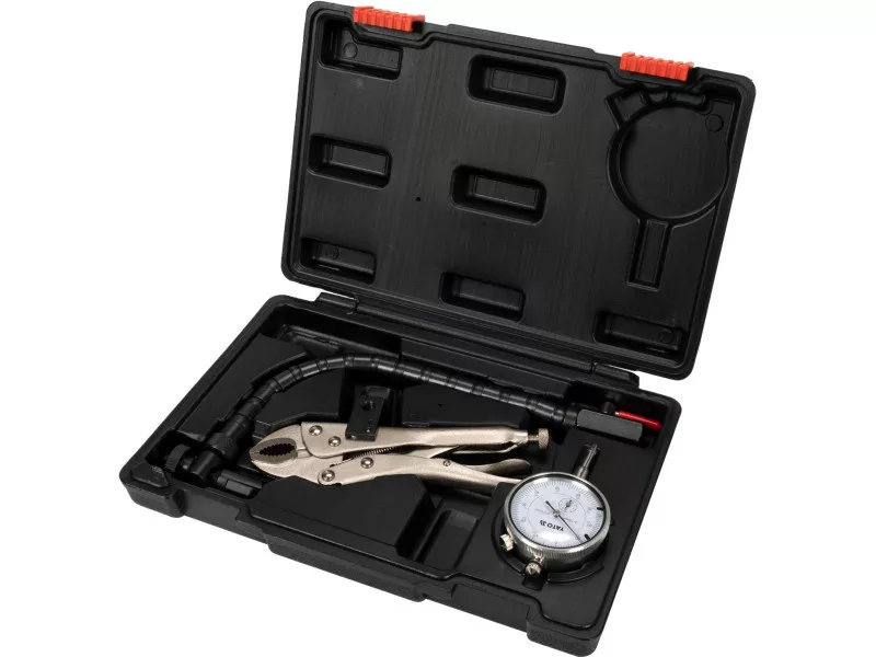 Brake disc run-out checking set: indicator dial gauge with accuracy of 0.01 mm, 10 mm range, flexible arm with screw lock, mounting clamp.