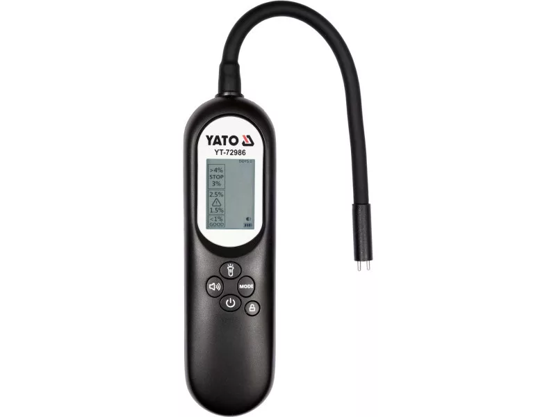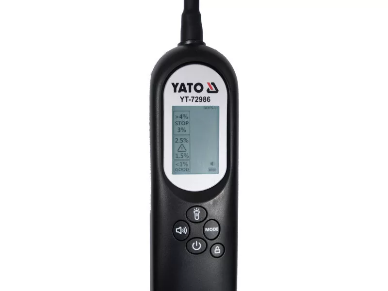 Brake fluid tester DOT3, DOT4, DOT5.1. Easy reading of the results thanks to the large liquid crystal display. Ergonomics of use is provided by the flexible probe with a length of 21 cm. The tester is powered by a 600 mAh rechargeable battery charged with a USB type C cable.