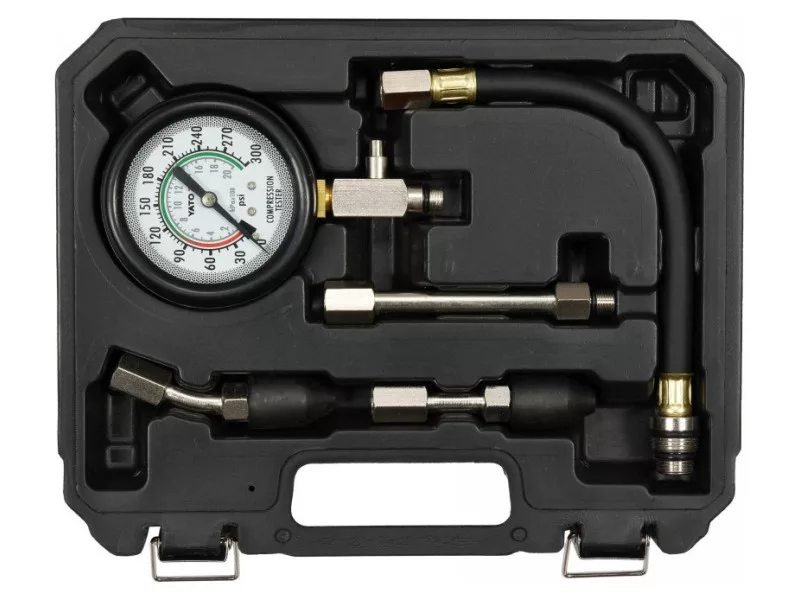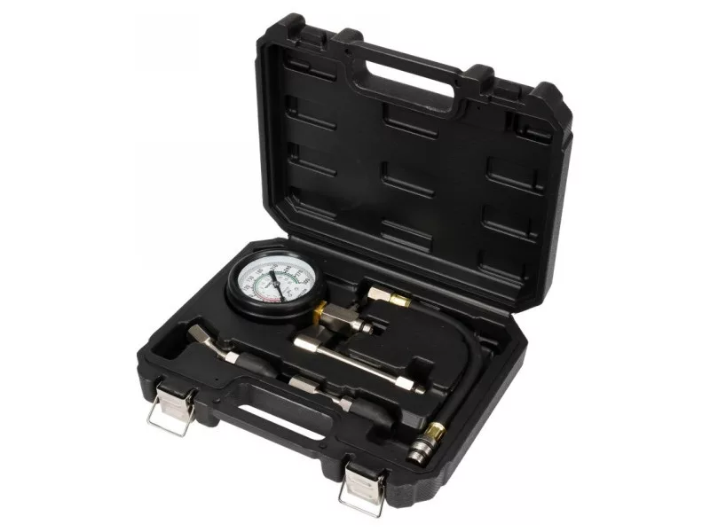 A five-piece kit designed to measure compression pressure in spark ignition engines. Recommended for automotive and mechanical services.