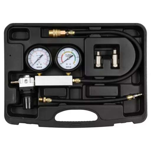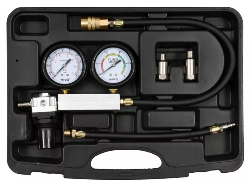 by supplying compressed air to the cylinder and determining the percentage of pressure drop caused by cylinder leaks. It detects, among other things. piston ring damage, damage to the intake or exhaust valve, damage to the head gasket.