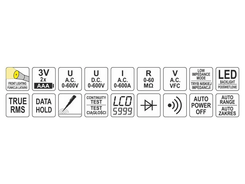- AC voltage measurement: A.C. 0-600 V, TRUE RMS + V.F.C. + lowZ