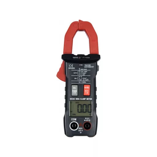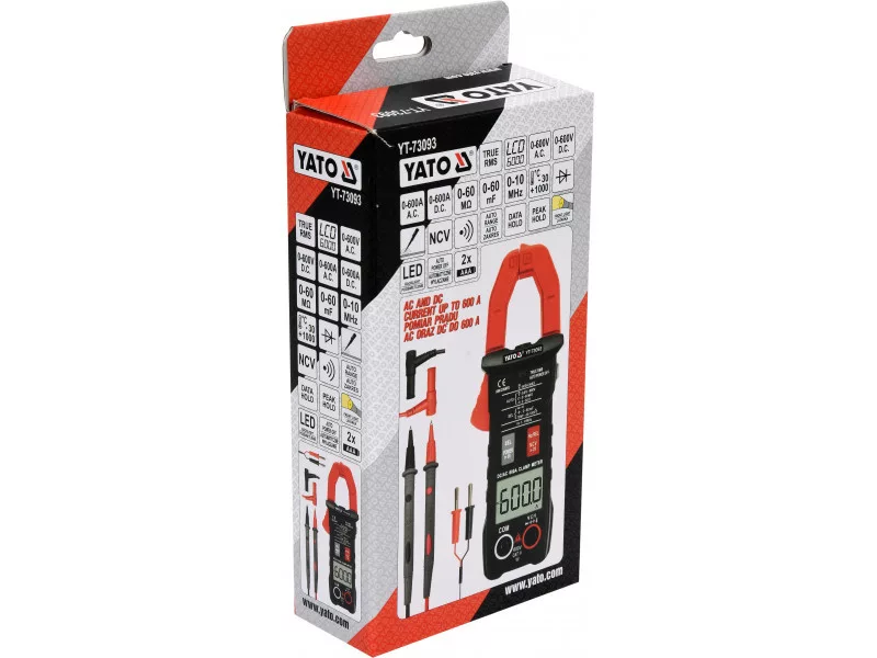 Universal clamp meter YT-73093 with automatic range selection for every measurement allows for basic and advanced measurements of electrical quantities. The meter is equipped with measurement clamps that allow for measurement of both direct and alternating current in a single wire using a built-in HALL sensor. The measurement can be done without disconnecting the circuit or disconnecting it from the power source and allows for measuring much higher current than conventional electrical meters. The measurement probe wires have silicone, flexible, and high-temperature resistant insulation.