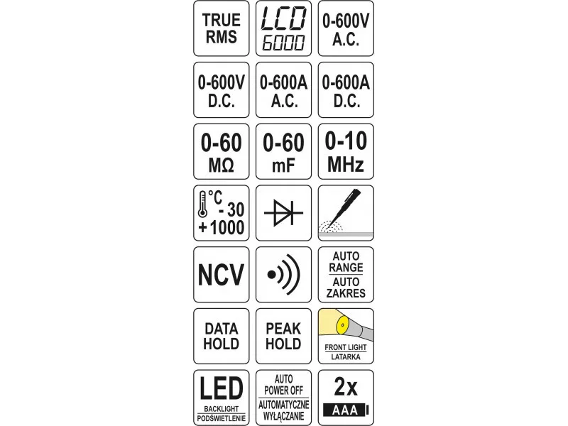 - measurement of alternating voltage: A.C. 0-600 V, TRUE RMS