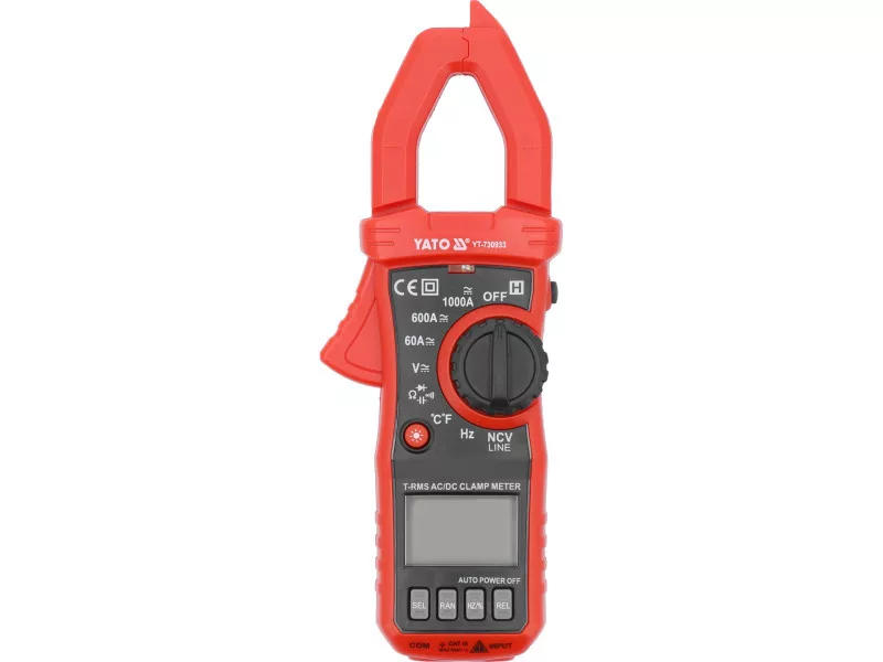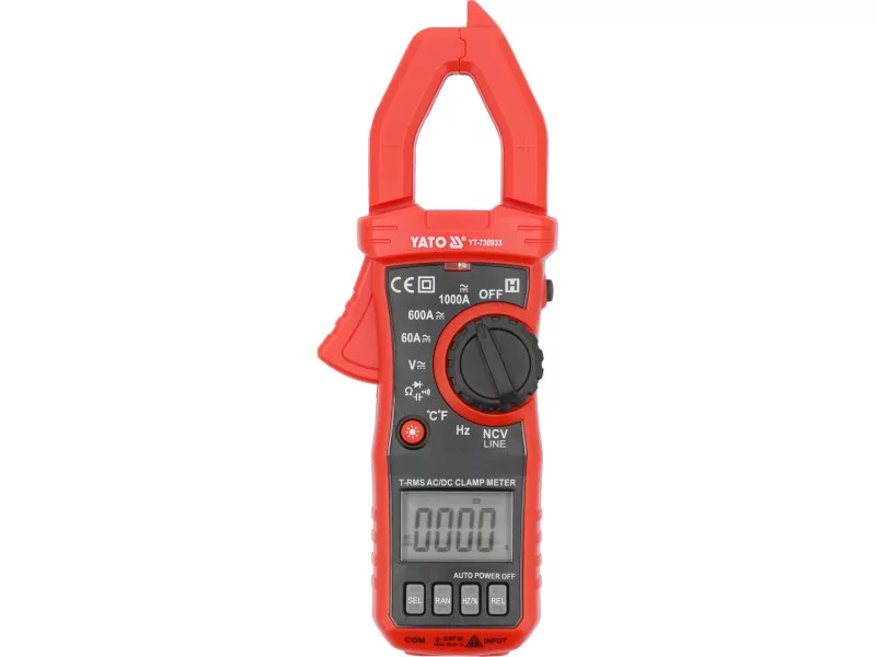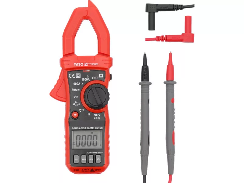 Universal clamp meter with TRUE RMS function, with automatic and manual ranging. It enables basic and advanced measurements of electrical quantities to be made. With the tongs, both DC and AC current can be measured in the range from 10 mA to 1000 A. The measurement takes place without disconnecting the circuit or disconnecting it from the power source. The meter allows a much higher current to be measured than conventional electrical meters. The probe cables have silicone insulation that is flexible and resistant to high temperatures.