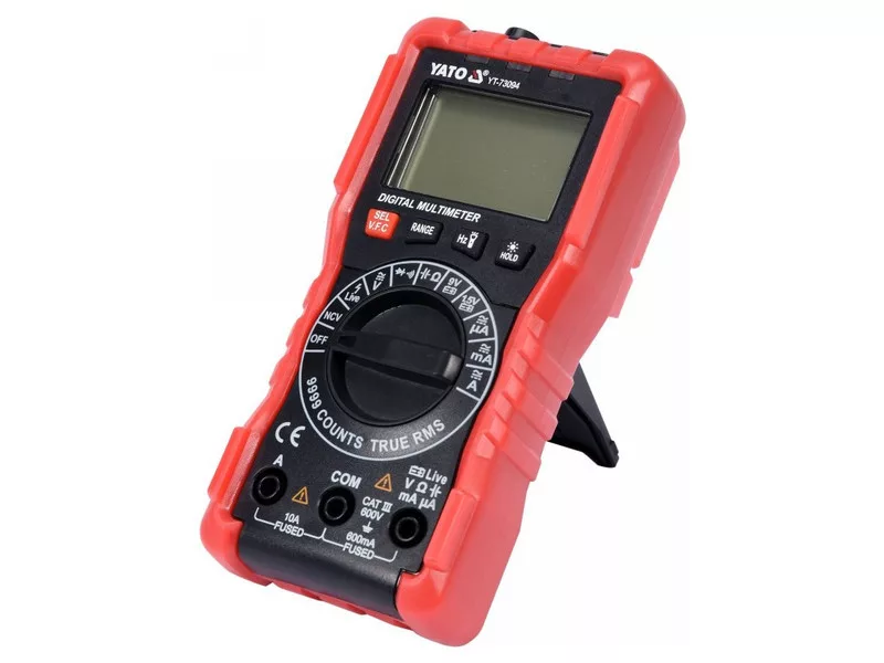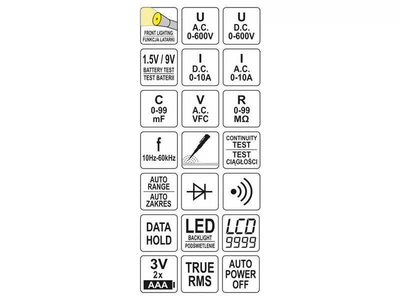 The YT-73094 universal meter with TRUE RMS function and automatic range for each measurement allows you to perform basic and advanced electrical measurements. An additional and useful option is the ability to detect AC voltage without contact, as well as detect the phase wire through the insulation. With the 1.5V and 9V battery test, we can check the voltage of the battery under load, this will help to assess its condition and exclude or confirm the need for replacement.