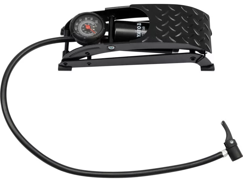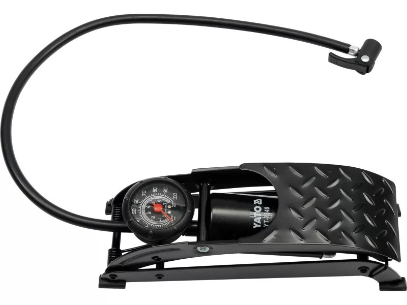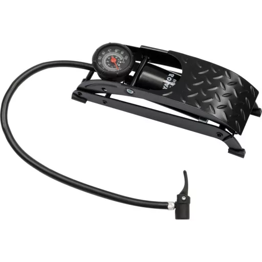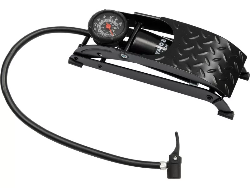 Single piston foot pump with solid construction, made of stamped, lacquered steel sheet 3 mm thick.