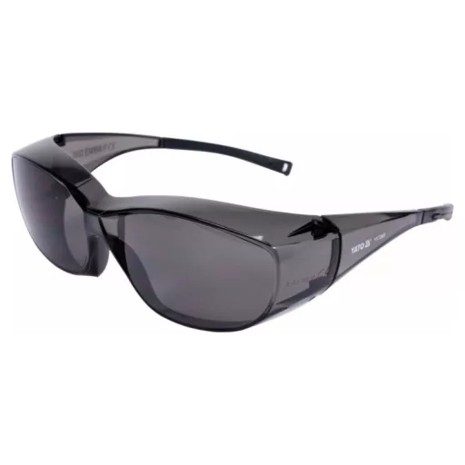 Protective eyewear YT-73603 designed for eye protection in manual and mechanical work. The "fit over" frame design allows the róon to wear corrective glasses.