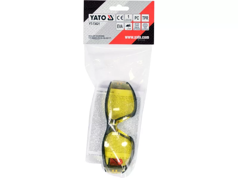 Protective eyeglasses YT-73621 with zólated lenses housed in comfort-enhanced frames. The yellow tinting filters out a wide spectrum of blue light, which in effect increases the contrast of the objects being viewedóly. This allows you to better focus on doing precision work, not just outdoors. The lenses have been coated with anti-fog and anti-scratch* coatings. The former prevents fogging of the glassesó the latter protects against excessive scratching. Glasses of the highest optical class do not distort the image, and also protectós from harmful UV radiation. The frames have been retrofitted with a removable EVA foam frame, whichóra reduces contact of hard elementsóaround the eyes. Weighing just 31 gramsóing, the soft, flexible, non-slip temple endsów make the glassesów almost impossible to feel on the head.
