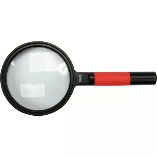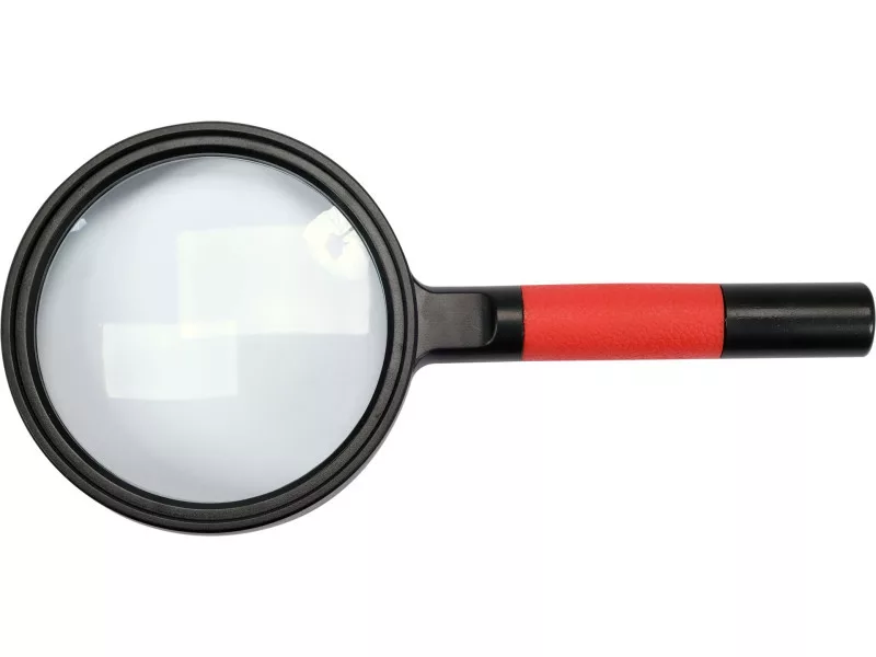Loupe with glass lens. Sturdy plastic housing, with a pleasant touch of red imitation leather. The 75mm diameter lens provides 4x magnification.