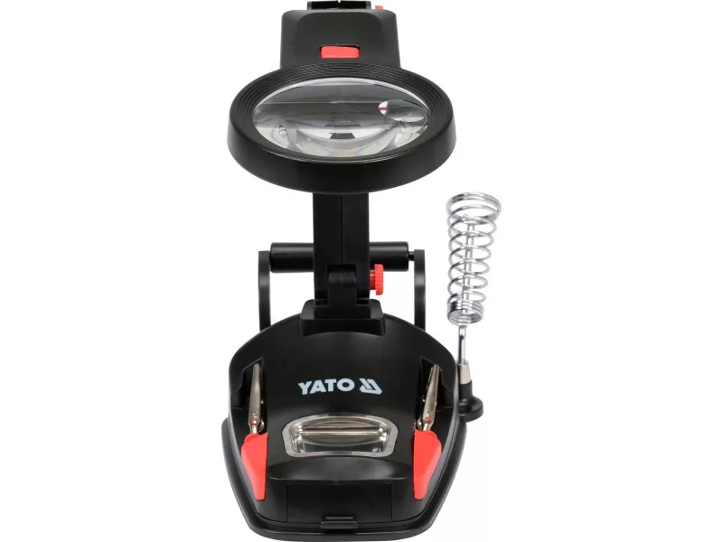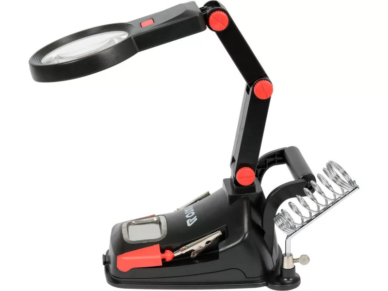 Third-hand type handle with ring-shaped illumination from 10 LEDs. Dual magnifier - the larger one with a diameter of 75 mm provides a magnification of x 3. The smaller magnifier - built-in, with a diameter of 20 mm magnifies the image x 4.5. The 360-degree swivel arm with angle adjustment in three places allows you to work freely both inside and outside the auxiliary clip area. Two crocodile clips mounted on the movable arms and on double ball joints provide a wide range of possibilities for adjusting the clips to both fine jewelry and small PCB sizes. A soldering sponge stand, a flask slot, a roll for mounting solder binder and a storage compartment, e.g. for disassembly screws, help organize your work.