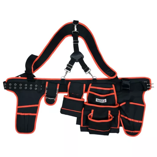 Tool belt with braces with two placed large holsters for power tools, a metal hammer handle and one deep pocket on a nail or screws. The length of the main belt fastened with a metal buckle is about 1280 mm. It is connected to a wide load -bearing belt mounted on wide braces. Braces balance the load by transferring them from hips to shoulders. This belt design facilitates work with a greater load. The whole is made of technical waterproof polyester fabric Oxford 600D. For storing and transporting tools used during work.
