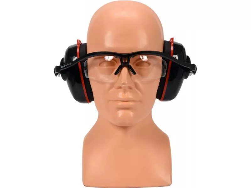 Earmuffs integrated with interchangeable clear safety glasses YT-74636 protect not only hearing but also the user's eyes. Eyeguards with adjustable ball joints at the same time act as a headband, which makes it possible to work, for example, in a protective helmet without additional pressure on the head.