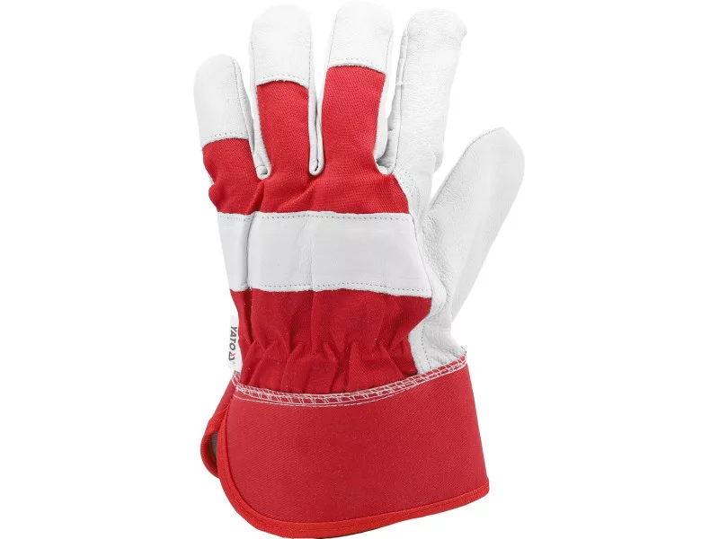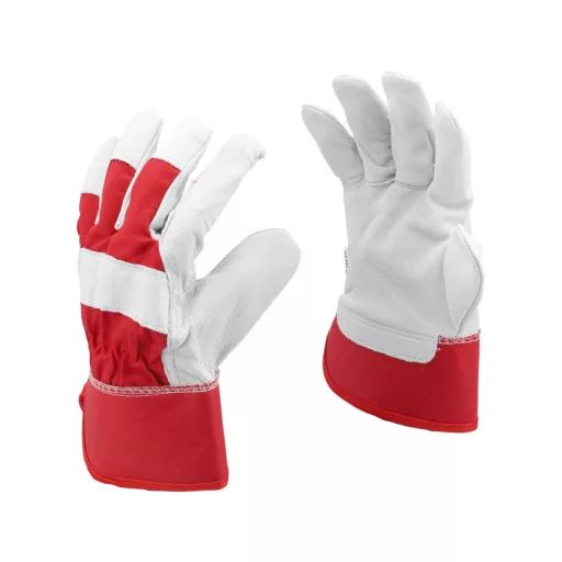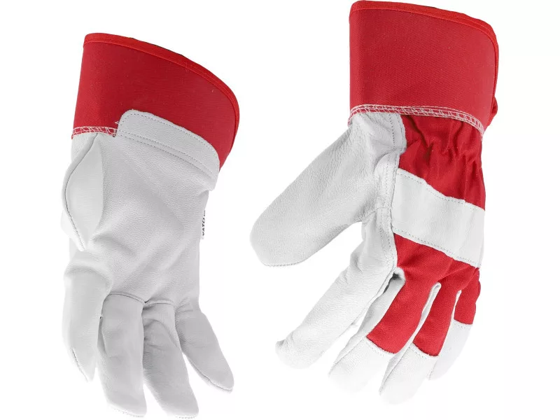 Construction gloves made of natural leather and cotton knitted fabric in red. The high quality of goat grain leather makes the gloves very pleasant to the touch, and the hands do not sweat excessively. They will prove especially useful when doing heavy construction work, in the garden, as well as anywhere where a high-precision grip is not required. grip part: natural grain leather upper part: leather and cotton knitted fabric cuff made of laminated cotton knitted fabric.