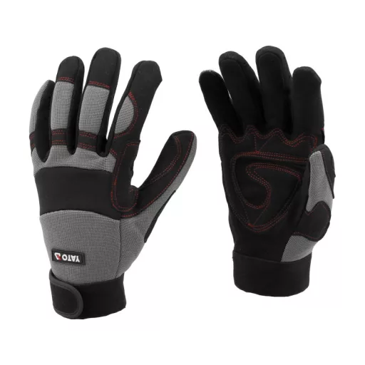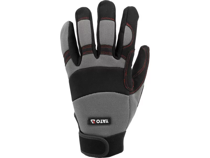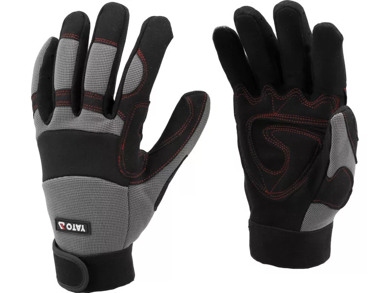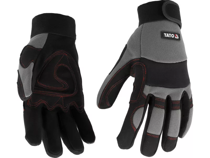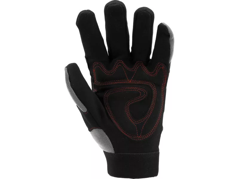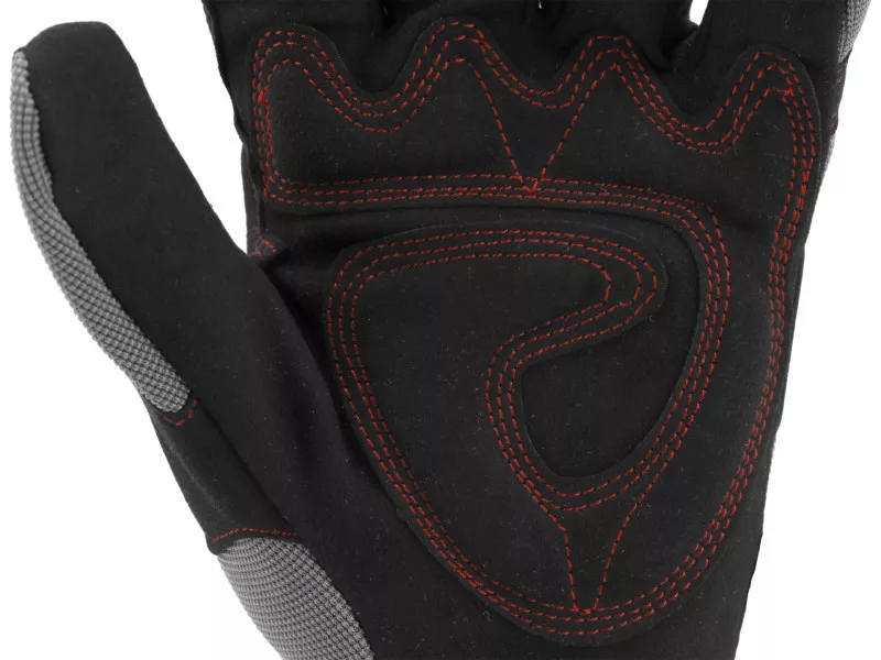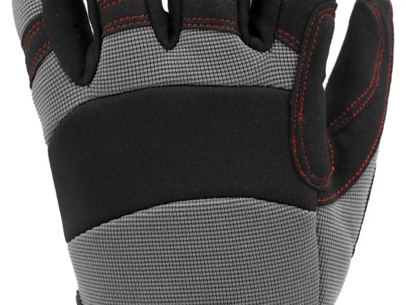 Made of synthetic leather, double-layered fabric with spandex and neoprene. Synthetic leather with additional reinforcements in the grip area ensures high durability and a good fit to the hand. Cushions protect against calluses. Neoprene on the knuckles stretches and moves with hand movements. The double-layered fabric on the top part made of durable nylon with added material giving it elasticity not only provides good protection against mechanical hazards but also high work comfort.