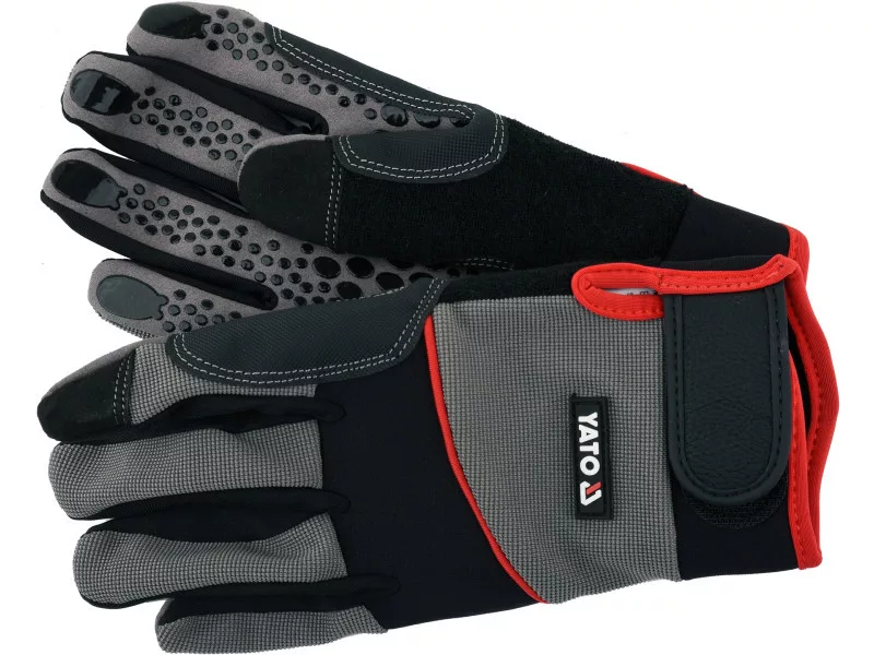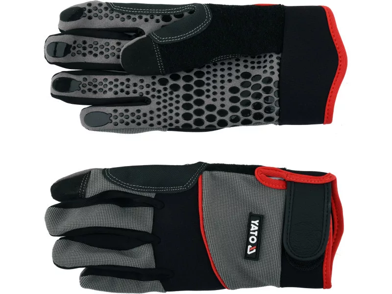Made of synthetic leather, double-layer fabric with spandex addition, and neoprene. Synthetic leather with additional reinforcements and silicone coating in the gripping part guarantee high durability, good fit to the hand, and above all strengthen the grip. Neoprene on the knuckles stretches and works with hand bends. A terry cloth fabric on the thumb for wiping sweat. The double-layer fabric on the top made of durable nylon with the addition of a material giving it elasticity not only provides good protection against mechanical hazards but also high work comfort.