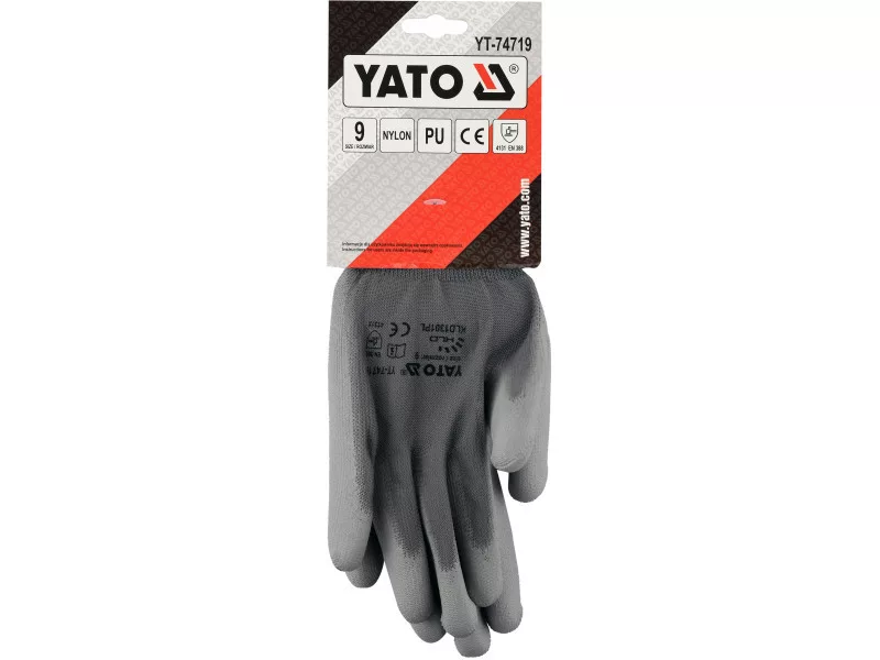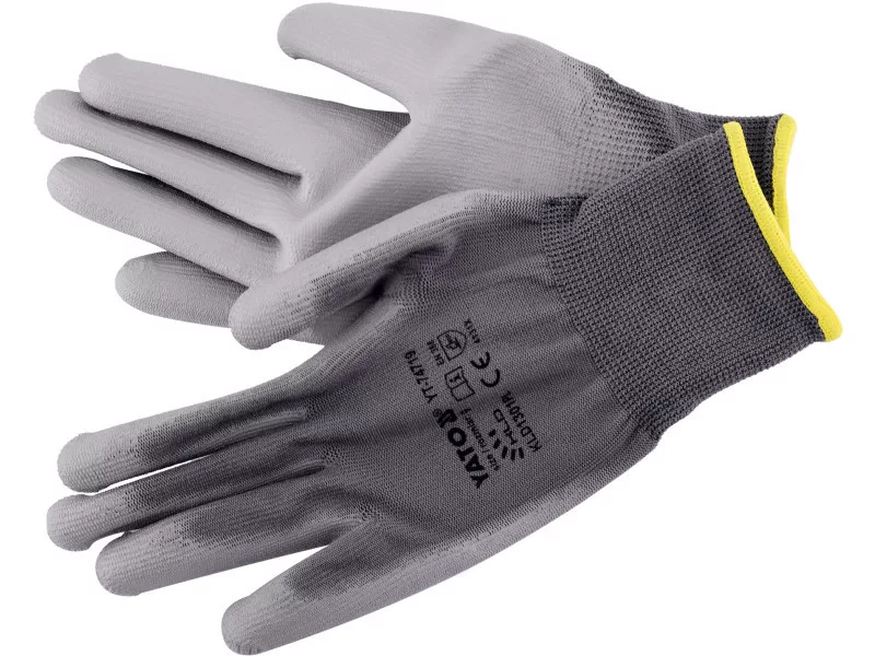 Protective work gloves made of gray polyester, coated in the grip part with gray polyurethane. The thickness of the coating provides almost the highest abrasion resistance according to EN 388. Seamless construction with high quality polyester guarantees increased tear resistance.