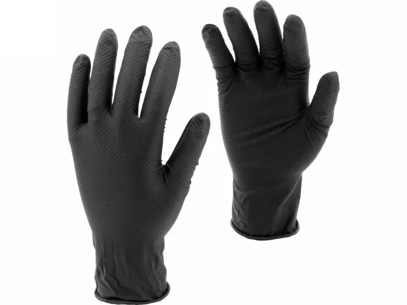 Nitrile gloves with a diamond texture designed for tasks requiring high mechanical and chemical resistance. Made of high-quality nitrile, they provide effective hand protection while maintaining good tactile sensitivity and precision of movements. The flexible material fits well to the hand, ensuring comfort during extended use.