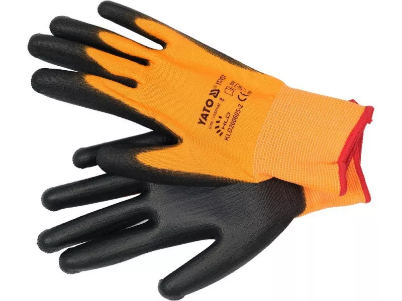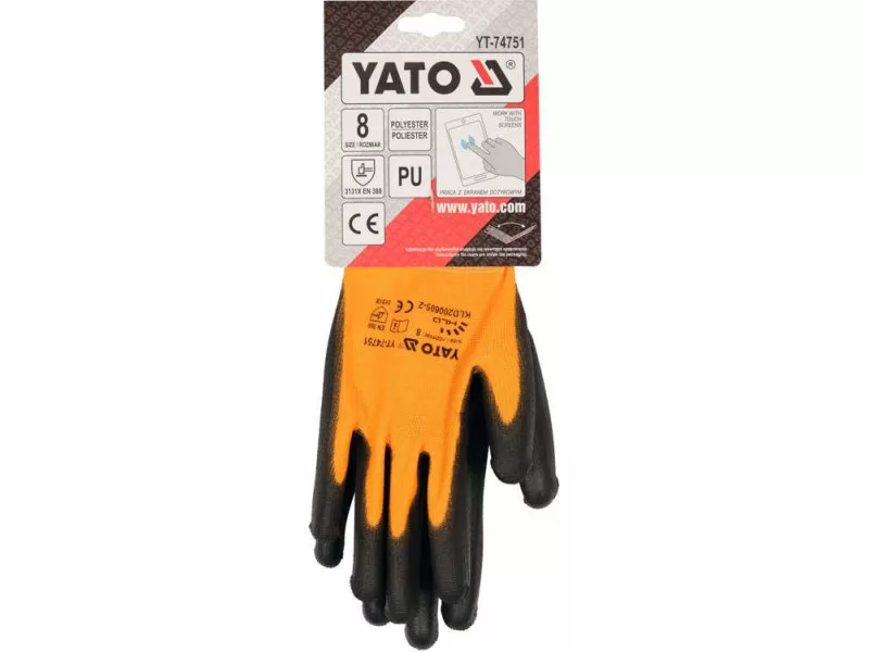 Protective work gloves made of orange polyester, coated in the gripping part with black polyurethane with a special admixture that allows smooth operation of touch screens in devices such as a smartphone or tablet. The thickness of coating ensures almost the highest abrasion resistance according to EN 388. The seamless construction made of high quality polyester guarantees increased tear resistance. Catching part: Coating from PU Toppiece: polyester stitch: 13g Flexible cuff for touch screens in smartphone devices: the currently most popular touch screens technology in smartphones uses the phenomenon of electric field change. Very precise service, gentle brushes instead of strong pressure are the convenience of appreciating by every user every day. The situation is different for people working in traditional coated gloves, which by definition limit the flow of current, and thus limit the changes in the electric field. Then the smartphone service becomes embarrassing, and in many situations it is impossible. The design of coated Yato gloves with a specially adolesated coating restores the flow of electron, which allows smooth operation of touch screens as much as without gloves on the hand.