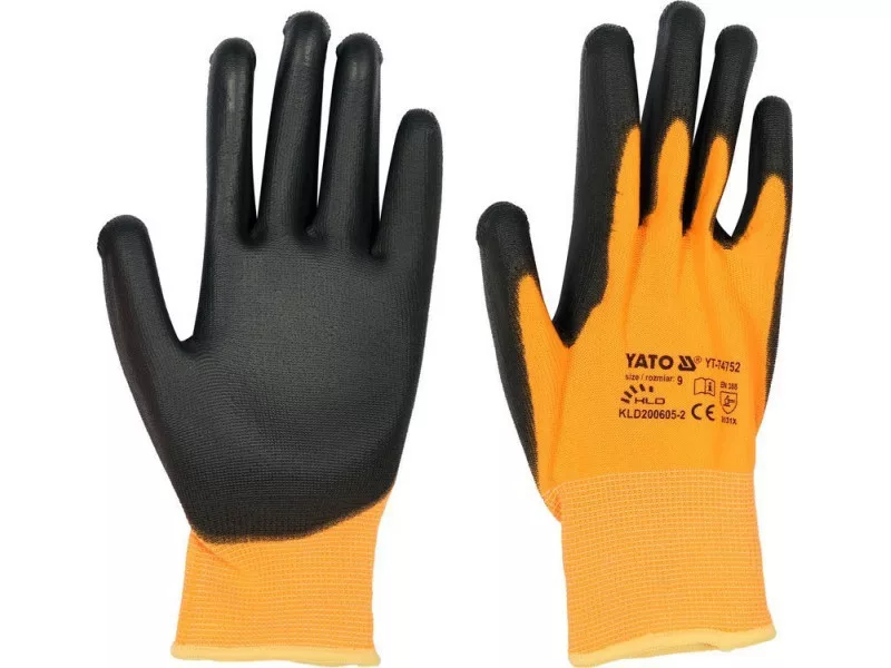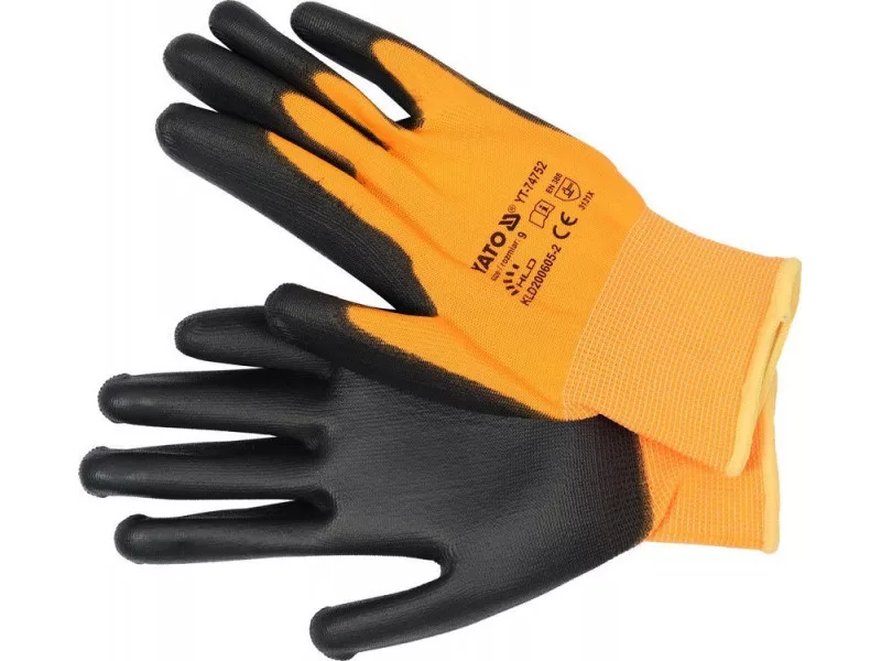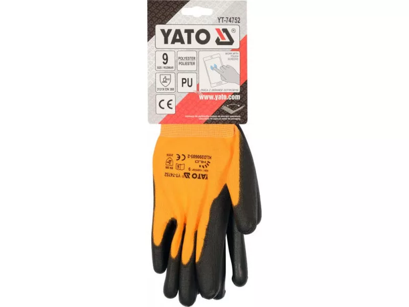 Protective work gloves made of orange polyester, coated in the gripping part with black polyurethane with a special admixture that allows smooth operation of touch screens in devices such as a smartphone or tablet. The thickness of coating ensures almost the highest abrasion resistance according to EN 388. The seamless construction made of high quality polyester guarantees increased tear resistance. Catching part: Coating from PU Toppiece: polyester stitch: 13g Flexible cuff for touch screens in smartphone devices: the currently most popular touch screens technology in smartphones uses the phenomenon of electric field change. Very precise service, gentle brushes instead of strong pressure are the convenience of appreciating by every user every day. The situation is different for people working in traditional coated gloves, which by definition limit the flow of current, and thus limit the changes in the electric field. Then the smartphone service becomes embarrassing, and in many situations it is impossible. The design of coated Yato gloves with a specially adolesated coating restores the flow of electron, which allows smooth operation of touch screens as much as without gloves on the hand.