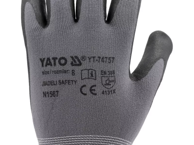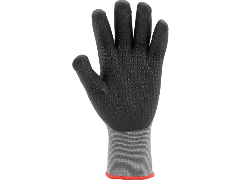 Protective work gloves made of dark gray nylon with the addition of spandex, coated in the gripping part foamed black nitrile with a nitrile dotty. An additional advantage of nitrile is resistance to gasoline, diesel, paraffin, solvents, lubricants, etc. Seamless construction of high -quality nylon is increased resistance to tearing and maintaining flexibility for a long time. A small 15g stitch, i.e. 15 stitches per inch, is a lower weight and even better adhesion to the hand. Nitrile anti -slip pronunciation strengthens the grip and confidence in holding dry objects. Casting part: coated with foamed nitrile with an additional ilter from nitrile dots, outer part: nylon with the addition of spandex stitch: 15g flexible cuff & nbsp;