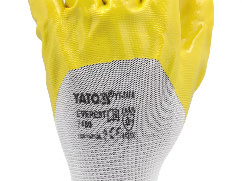Protective work gloves made of white polyester, coated in the gripping part, as well as partially in the upper part with yellow nitrile. A suitably thick coating layer provides the highest abrasion resistance according to EN 388 standard. An additional advantage of nitrile is resistance to gasoline, diesel fuel, paraffin, solvents, greases, etc. The seamless construction of basic quality polyester ensures good tear resistance.
