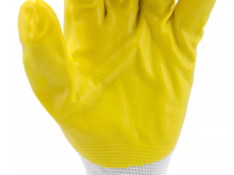 Protective work gloves made of white polyester, coated in the gripping part, as well as partially in the upper part with yellow nitrile. A suitably thick coating layer provides the highest abrasion resistance according to EN 388 standard. An additional advantage of nitrile is resistance to gasoline, diesel fuel, paraffin, solvents, greases, etc. The seamless construction of basic quality polyester ensures good tear resistance.
